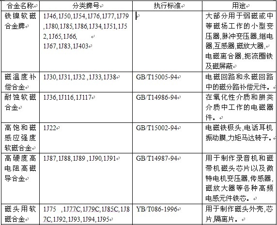 軟磁合金主要用作電器、電信工業中的各種鐵芯元件(如變壓器鐵芯、繼電器鐵芯、扼流圈等)。常用軟磁合金有低碳電工鋼、阿姆科鐵、硅鋼片、鎳鐵軟磁合金、鐵鈷軟磁合金、鐵硅軟磁合金等。