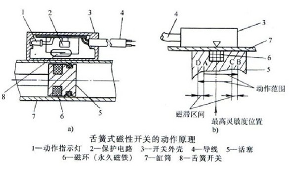 將舌簧開(kāi)關(guān)成型于合成樹(shù)脂塊內(nèi),帶有磁環(huán)的氣缸活塞向右運(yùn)動(dòng)到A位置,舌簧開(kāi)關(guān)進(jìn)入磁場(chǎng)內(nèi),兩簧片被磁化而相互吸引,觸點(diǎn)閉合,發(fā)出一電信號(hào);活塞運(yùn)動(dòng)到B位置時(shí),舌簧開(kāi)關(guān)離開(kāi)磁場(chǎng),簧片失磁,觸點(diǎn)自動(dòng)脫開(kāi)。A-B區(qū)間稱為磁性開(kāi)關(guān)的動(dòng)作范圍。活塞向左反向運(yùn)動(dòng)時(shí),動(dòng)作范圍是C-D區(qū)間。有觸點(diǎn)式磁性開(kāi)關(guān)的動(dòng)作范圍一般在5-14mm。B-C區(qū)間和D-A區(qū)間稱為磁滯區(qū)間,此區(qū)間通常小于2mm。扣除磁滯區(qū)間的動(dòng)作范圍為最適合安裝位置,其中間位置稱為最高靈敏度位置。若磁環(huán)停止在磁滯位置,則開(kāi)關(guān)動(dòng)作不穩(wěn)定,易受外界干擾。